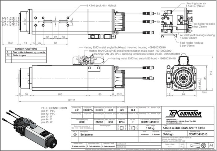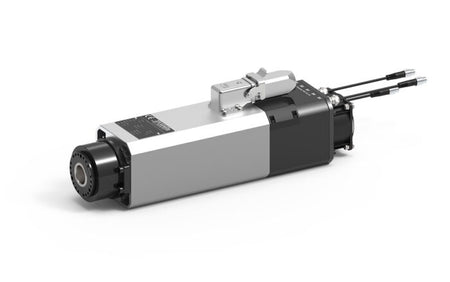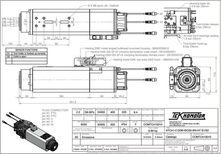 The electrospindles series ATC41 have been designed to develop high power with limited overall dimensions and low weight, only 5.9kg. This type of electrospindle is suitable to be installed on automatic machines, robotic application, cnc routers and desktop routers for machining wood, aluminum, plastics and composite materials. Thanks to the stiffness of the mechanical components, the speed of tool changing and the goodness of electrical components of this electrospindle, Teknomotor wanted to offer a best in class product for the most demanding customers. This version is equipped with ISO20.